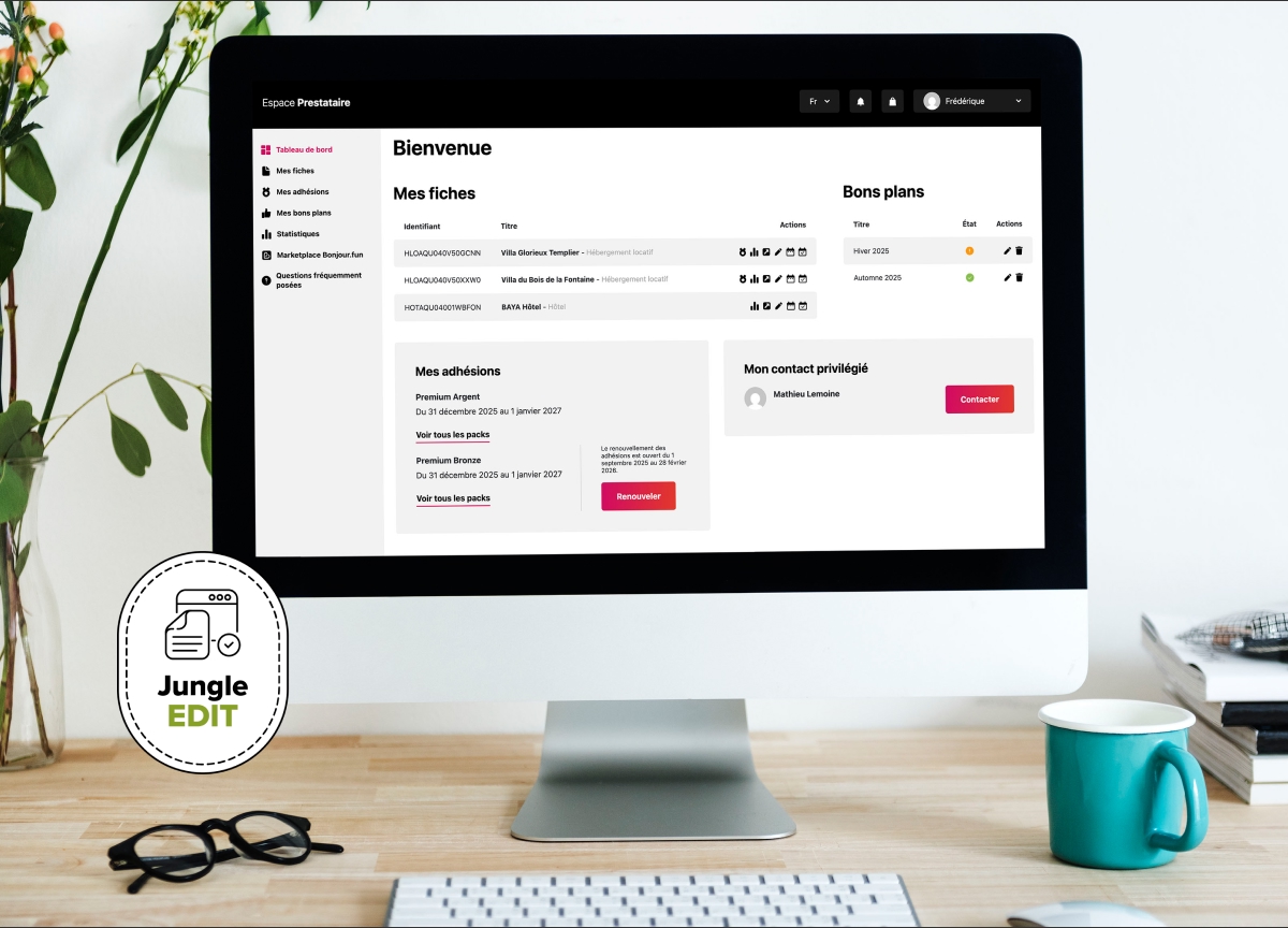 Véritable espace de travail connecté et autonome, Jungle Edit offre à chaque socio-professionnel les outils nécessaires pour gérer ses contenus, ses offres, sa visibilité et ses adhésions — le tout depuis une interface claire.